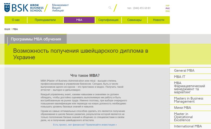 В Украине образование по этой системе предоставляет киевская Бизнес-школа КРОК. Обучение, которое вы сможете пройти на её базе, полностью соответствует всем стандартам Swiss Montreux Business School, все преподаватели прошли необходимую сертификацию и по окончании курса вы получите диплом МВА общего образца.