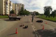 30 мая в Барановичах произошло дорожно-транспортное происшествие с участием грузового автомобиля «Мерседес-Бенц» и мотоцикла.