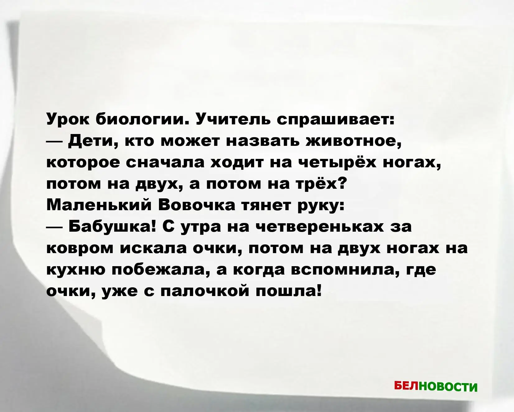 — Дети, кто может назвать животное, которое сначала ходит на четырёх ногах, потом на двух, а потом на трёх?