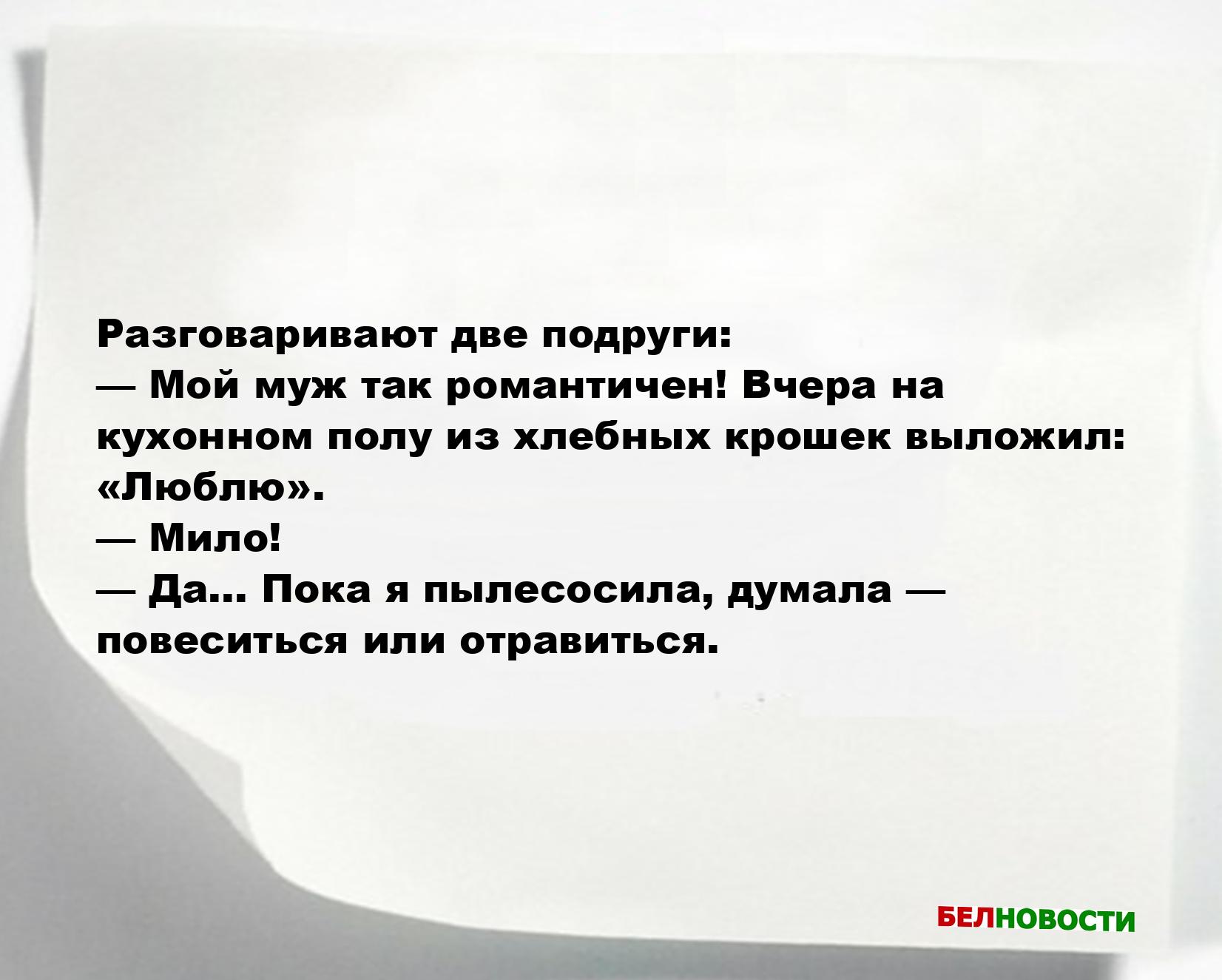 — Мой муж так романтичен! Вчера на кухонном полу из хлебных крошек выложил: «Люблю».