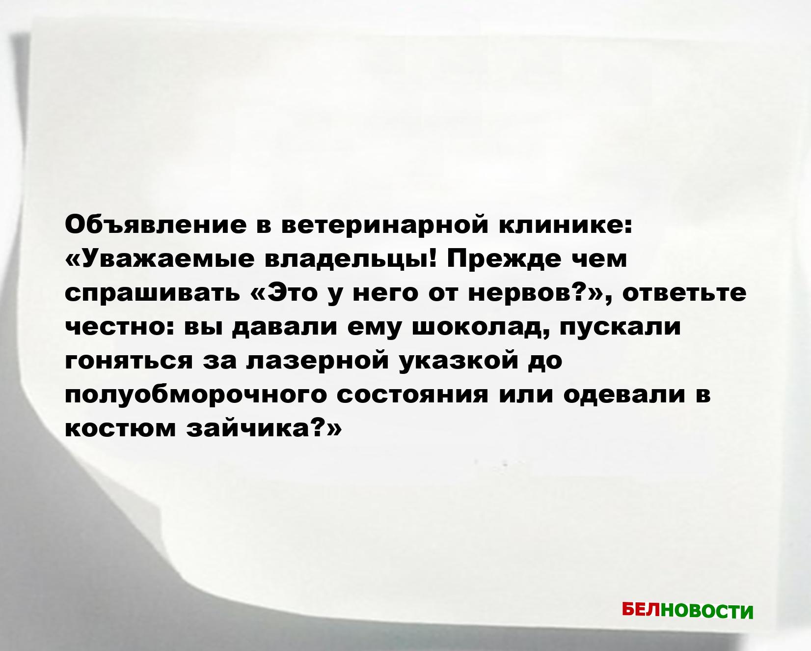 «Уважаемые владельцы! Прежде чем спрашивать «Это у него от нервов?», ответьте честно: вы давали ему шоколад, пускали гоняться за лазерной указкой до полуобморочного состояния или одевали в костюм зайчика?»
