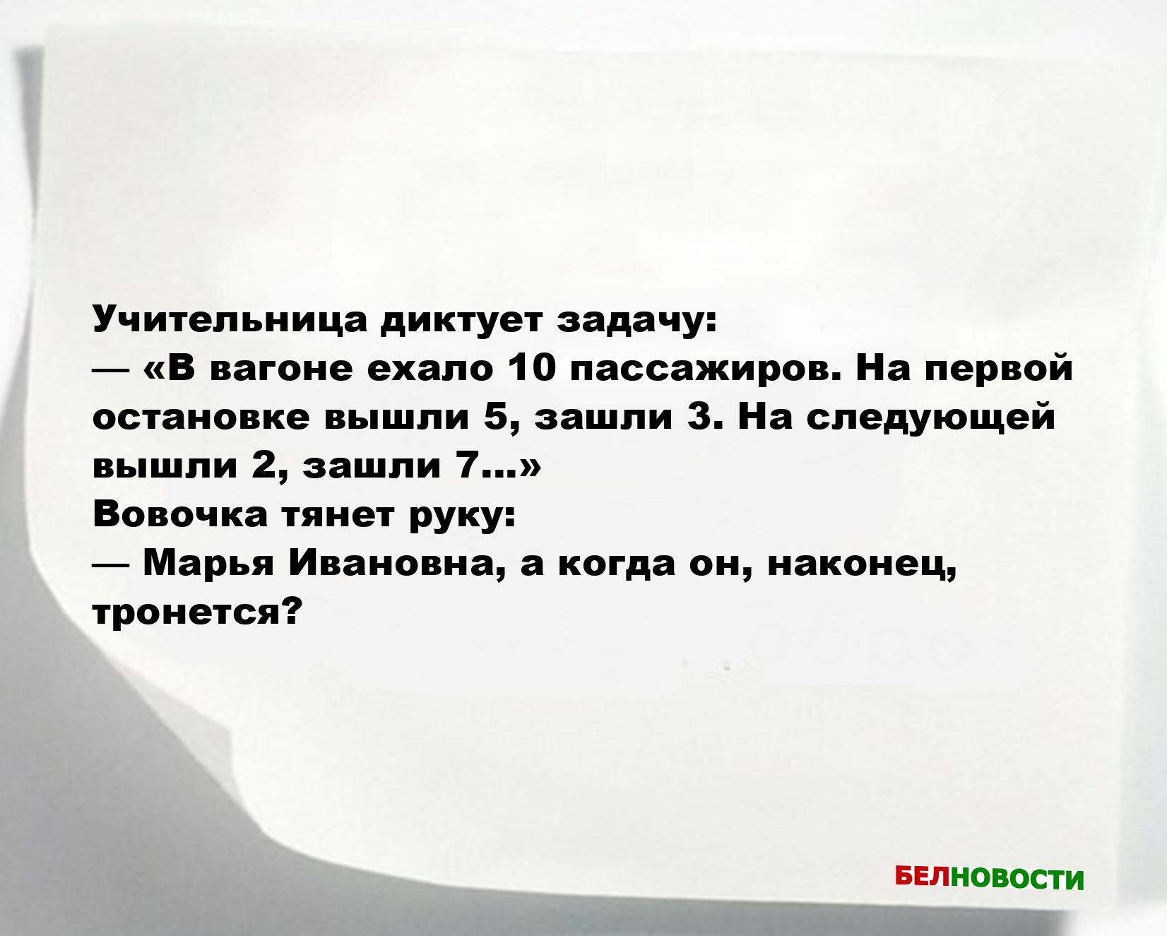 — «В вагоне ехало 10 пассажиров. На первой остановке вышли 5, зашли 3. На следующей вышли 2, зашли 7...»