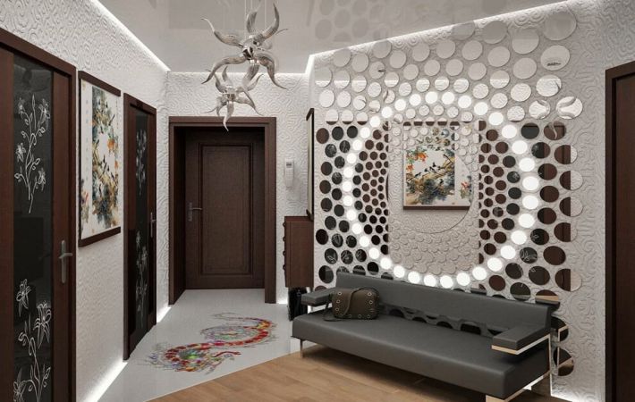 Дизайнеры советуют не ограничиваться стандартным воображением, а поиграть с разными формами и размерами зеркал, сформировав «зеркальную картину».
