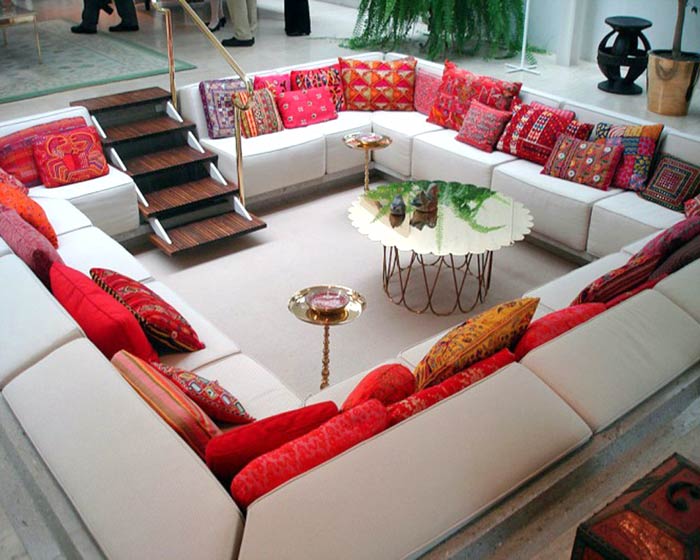 А самым оригинальным решением будет организация места для отдыха посередине комнаты, углубив его в пол. Такое зонирование с использованием декоративных подушек создаст уютную атмосферу.