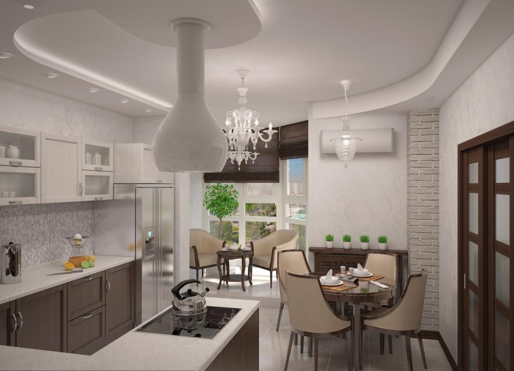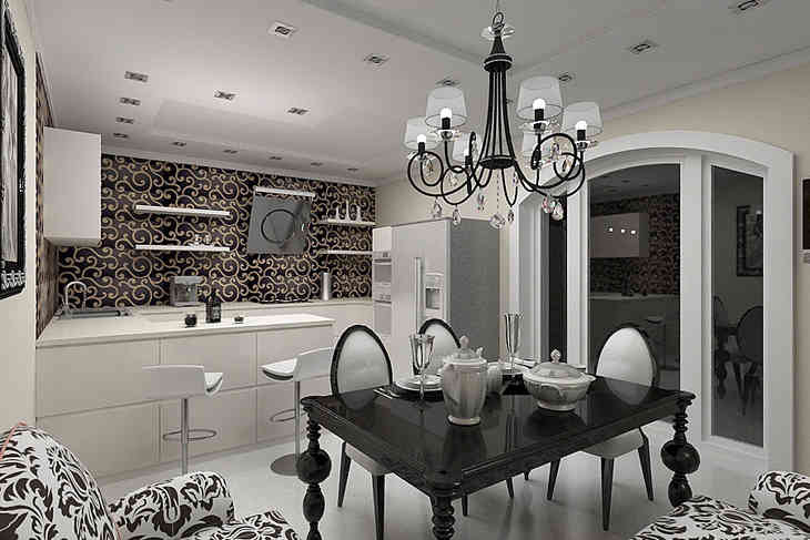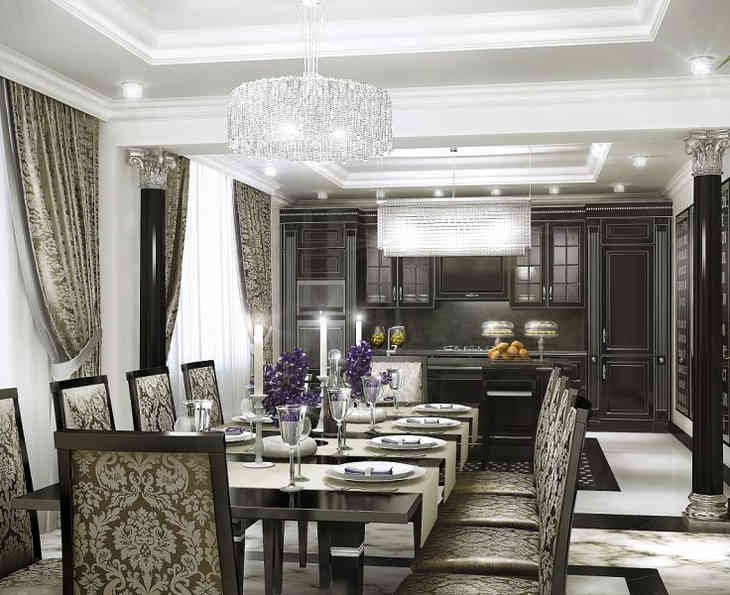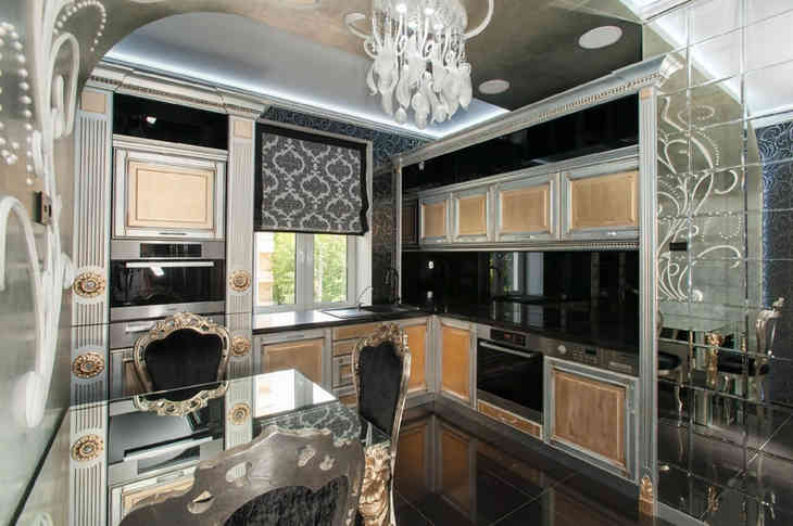 В интерьере присутствует огромное количество осветительных приборов, фурнитура, хромированные ножки предметов мебели, что придают кухне элитный лоск.