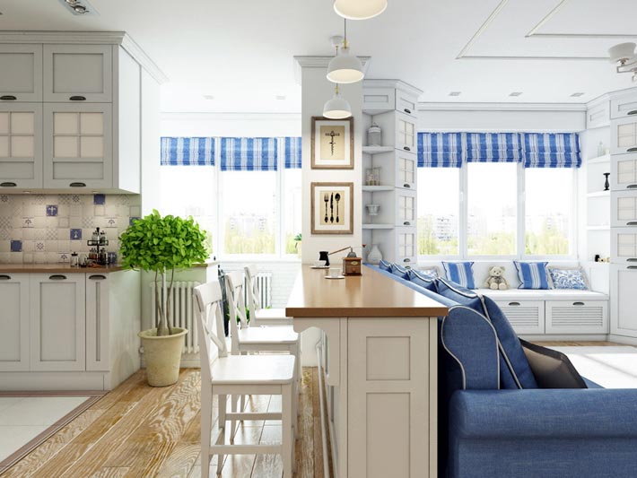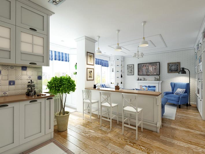Украинские дизайнеры смогли в классической стандартной квартире воплотить стиль прованс с использованием параллельно небольших элементов, взятых из кантри и скандинавского направления.