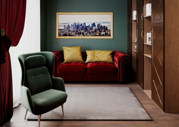Один большой ковер на всю маленькую гостиную, или спальню сконцентрирует внимание исключительно на зоне своего покрытия, визуально еще сильнее сузив пространство. Особенно это заметно в случае с ярким, узорчатым ковром, задерживающим взгляд.