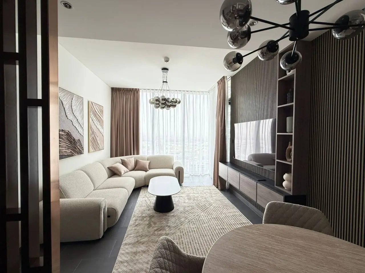 Зеркало можно разместить за диваном или обеденным столом. Это создаёт ощущение глубины без лишнего блеска.