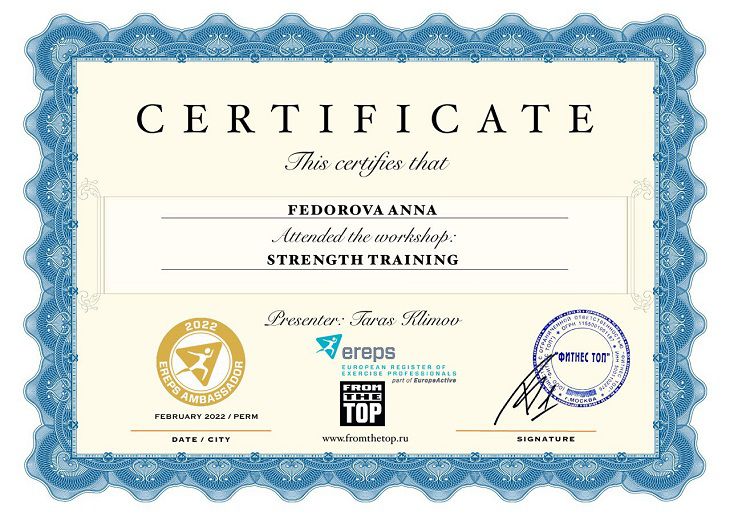 Проходила обучение по STRENGTH TRAINING у международного презентора в сфере фитнеса, а также выпускника высшей спортивной школы, Дания) - Тараса Климова.