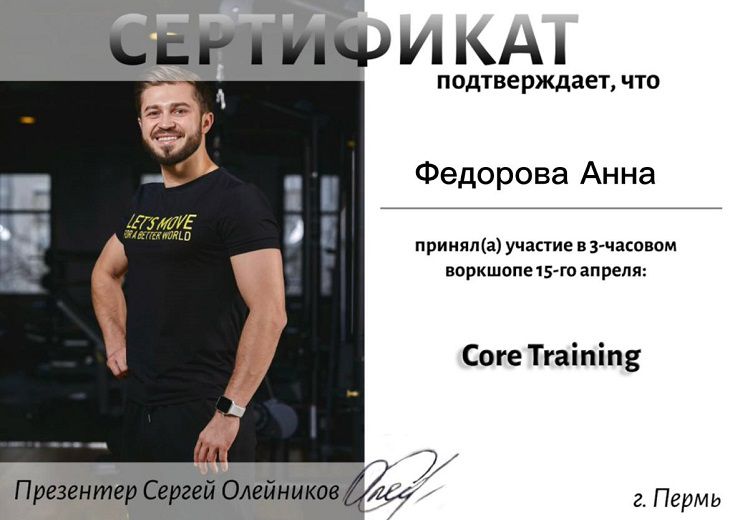 Обучалась у Сергея Олейникова ( Презентер российских и международных конвенций) по направлениям CORE TRAINING, ягодицы 3D.