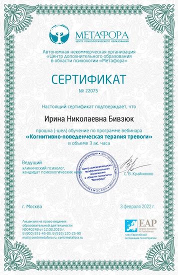 В 2020г. прошла обучение York University ( Leslie S.Greenberg) по программе «Эмоционально- фокусированная терапия». Дополнительно обучалась в Центре дополнительного профессионального образования в области психологии «Метафора» по программам «Психотерапия неврозов и панических атак», «Когнитивно-поведенческая терапия тревоги».
