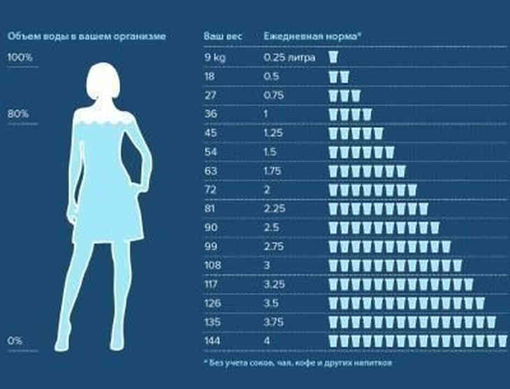 Вопрос в другом – сколько? Здесь ученые тоже сказали свое веское слово: необходимую норму можно высчитать исходя из общей массы тела – на килограмм веса должно приходиться 40 мл воды. Наглядный материал поможет рассчитать ваш водный минимум без калькулятора: