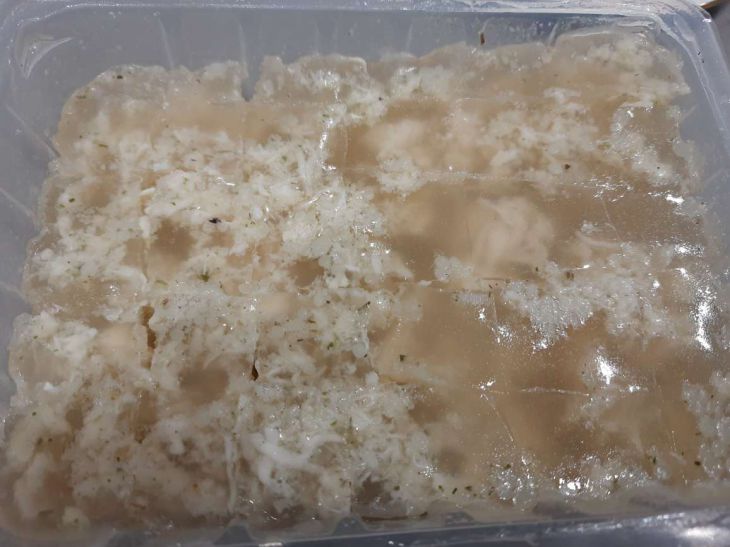 Агар обладает мощными желирующими свойствами. Для холодца достаточно нескольких граммов, чтобы бульон превратился в упругое желе.
