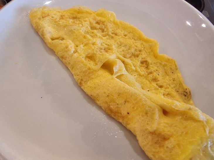 Правильно приготовленный омлет имеет бархатистую поверхность и равномерную текстуру по всему объему.
