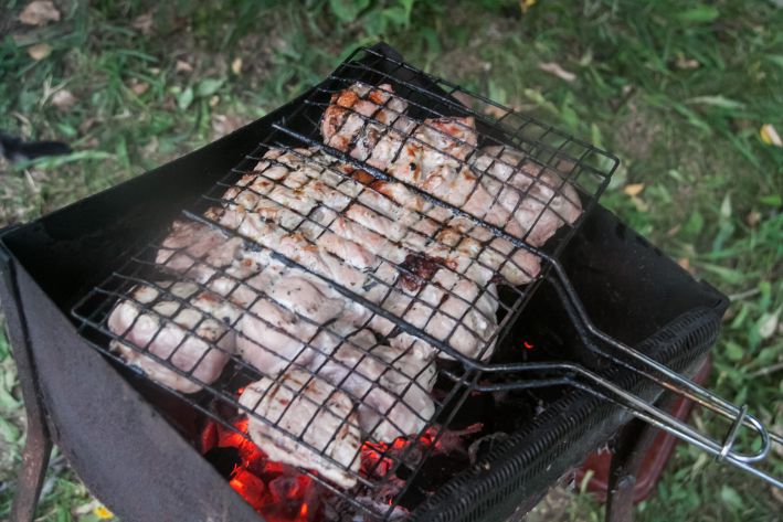 Жарить шашлык нужно на умеренном жаре. Сильный огонь снаружи поджаривает, а внутри оставляет сырым.