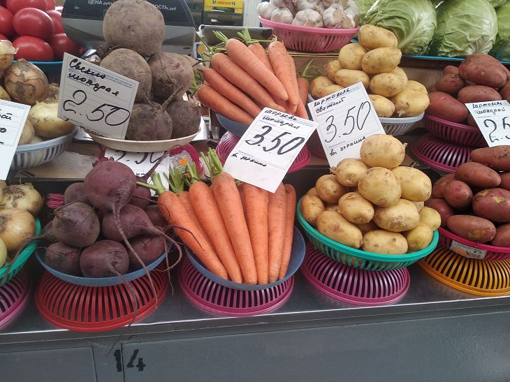 Цены на овощи на рынке также медленно изменяются. Молодой картофель стоит 3,5 рубля, свекла – 2,50, морковь - 3,5 рубля.