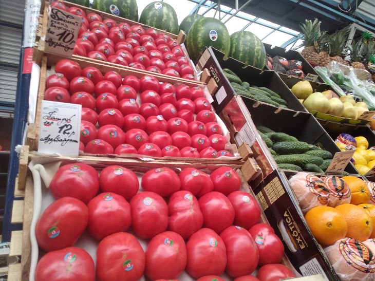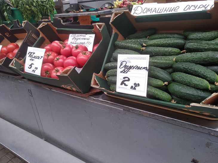 На прилавках продолжает увеличиваться количество огурцов и помидоров. Цена на них начинается от 1,90 и заканчивается 12 рублями. Перцы стоят от 2,5 рублей, огурцы – от 2,80.