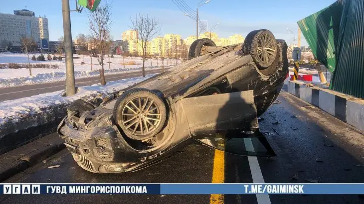 Как сообщили в ГАИ, речь идет о бетонном блоке. От удара иномарка опрокинулась, оказавшись на боку.