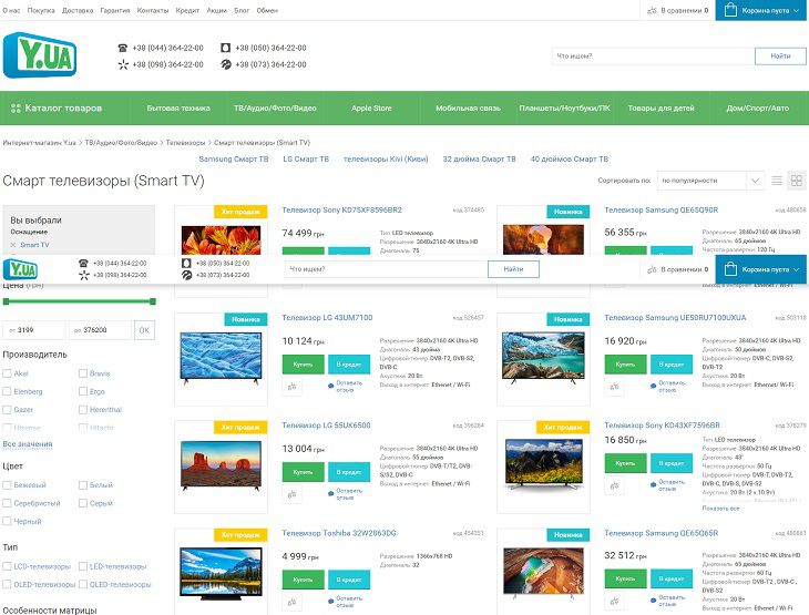 y.ua – это интернет-магазин, у которого нет большой рекламы. Соответственно попадая на его страницы, каждый сможет удивиться приемлемым ценам и огромному ассортименту. Конечно, некоторые люди привыкли покупать только в больших магазинах с проверенной временем репутации. Но, если вы не хотите сэкономить и получить отличный ТВ, зачем читать эту статью?