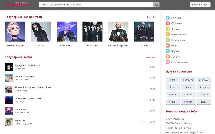 Музыкальный портал tunes был создан для обычных пользователей, которые хотят регулярно скачивать и слушать новые хиты. На сайте разработан простой и понятный интерфейс, с которым сможет разобраться даже тот человек, который никогда не сидел за компьютером до этого.