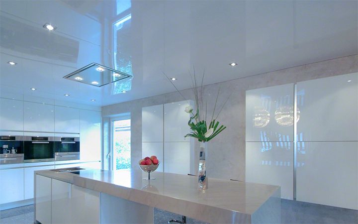 Глянцевая поверхность возможна на пленочном натяжном потолке. Такое решение прекрасно подходит для невысоких комнат, в которых необходимо увеличить высоту, так как поверхность потолка отражает свет, создавая нужную оптическую иллюзию. Такая поверхность хорошо зарекомендовала себя в местах, где повышена вероятность появления загрязнений, так как поверхность легко поддается мытью.