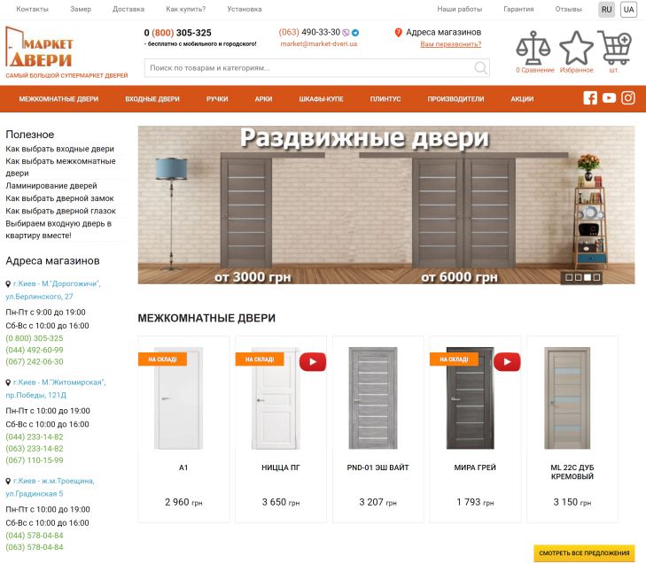 Магазин «Маркет Двери» по праву считается одним из самых популярных. В Киеве можно встретить 7 магазинов, где каждый может потрогать двери руками и оценить все их достоинства в живую. А если хочется немного сэкономить время и не тратить его на просмотр, всегда можно оформить заказ в интернете. Ассортимент насчитывает более 1000 входных дверей и 5000 межкомнатных, так что даже самый требовательный клиент найдет для себя все необходимое.
