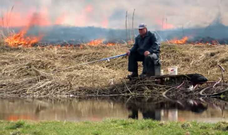 Например, бесстрашный рыбак, который ни под каким предлогом не собирался прекращать рыбалку. Видимо, хороший клев заставил сурового рыбака забыть о бушующем пламени за спиной.