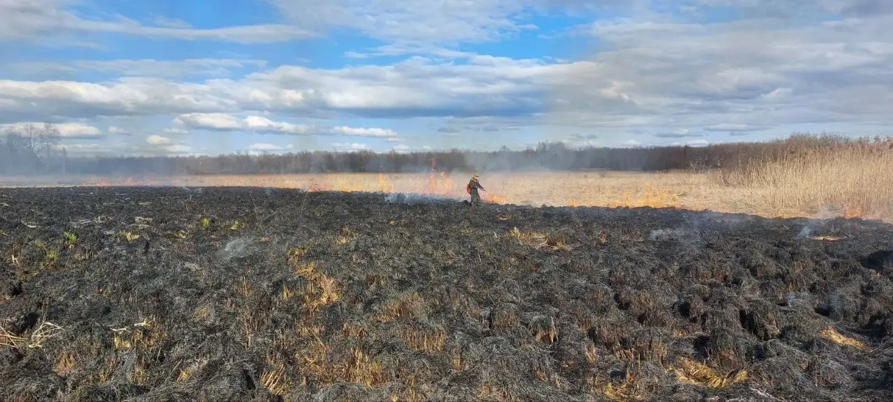 Сегодня, 13 апреля 2026 года, лесная охрана Крупского лесхоза ликвидировала крупный пожар в пойме реки Югна. Возгорание сухой растительности и тростника произошло на труднодоступной болотистой местности.