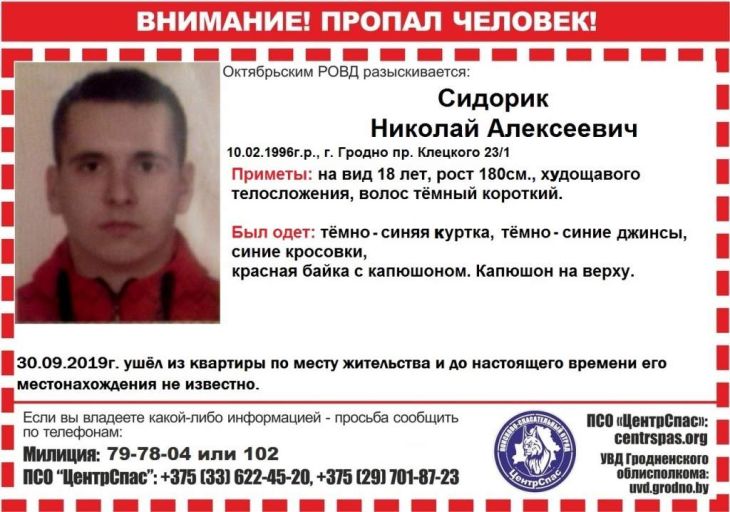 В понедельник, 30 сентября, в Гродно пропал 23-летний молодой человек, о местонахождении которого по сей день ничего неизвестно.