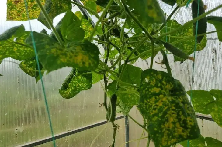 Паутинный клещ, невидимый до появления дырчатых листьев, особенно комфортно чувствует себя в защищённых условиях теплицы, где быстро размножается.