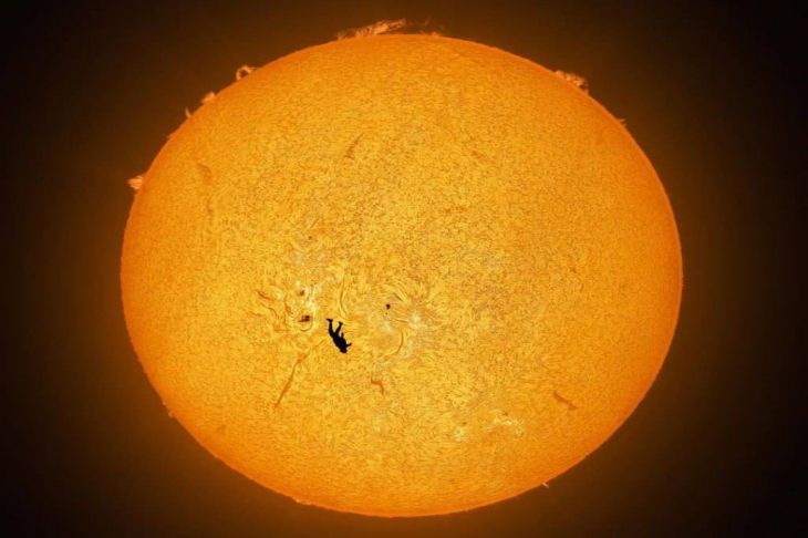 На снимке невооруженным глазом можно различить силуэт человека, пребывающего в свободном падении на фоне кипящей поверхности Солнца.