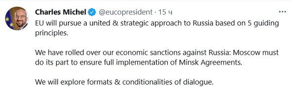 О решение продлить экономические санкции в своем Twitter-аккаунте написал глава Европейского совета Шарль Мишель